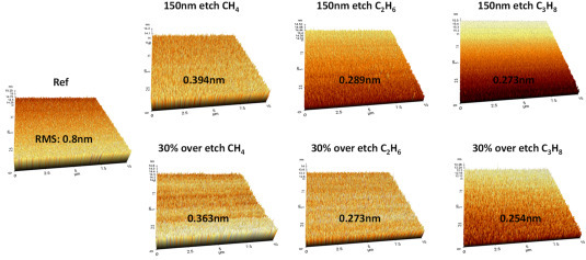 roughness는 *RMS surface roughness 측정 이미지를 확인하면 더 극명하게 보여지는데, CH4에 비해 C3H8이 거의 50% 가량의 차이가 발생함 (0.394nm to 0.273nm)