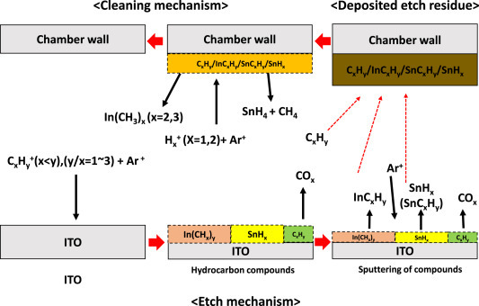 3) Dry cleaning의 경우, H2/Ar 기반 플라즈마를 활용하여 성공적인 공정이 가능하였으며, 이러한 공정으로 InCxHy (x < y), COx, SnHx가 생성됨