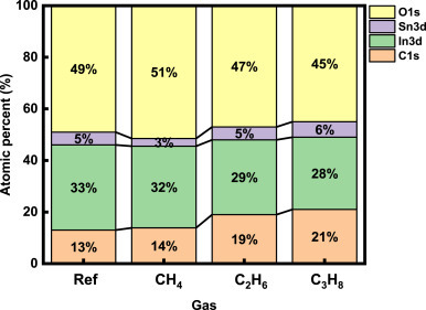 XPS 분석을 통해 아래와 같은 결과를 확인할 수 있는데, CH4에서 Sn의 비율이 낮아지는 이유는 byproduct으로 SnH4를 형성하는 데 SnH4의 경우 boiling point가 -52°C로 매우 높은 volatility를 가지고 있기 때문에 Sn 성분이 휘발되어 아래와 같은 결과가 발생함